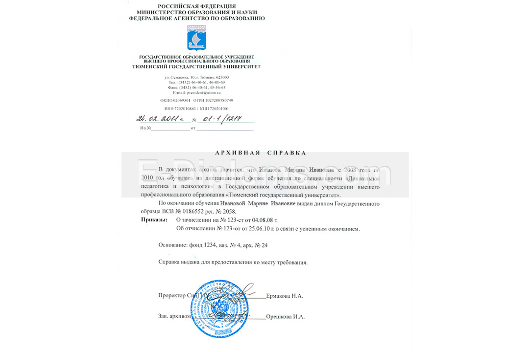 Вы можете купить архивную справку, подтверждающую факт Вашего обучения в вузе или колледже / техникуме, а также факт выдачи диплома об образовании. Справка обязательно содержит информацию о том, в какой период и по какой специальности обучался студент, а также серию и номер полученного документа. Заполняем по образцу выбранного учебного заведения. Доставка бесплатна, оплата при получении, для проживающих в регионах доступна услуга «макет», есть скидки. При заказе до 14.00 привезем уже завтра!